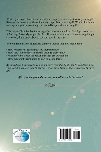 What if you could learn the name of your angel, receive a picture of your angel's likeness, and receive a five-minute message from your angel? Would that initial message stir your heart enough to start a dialogue with your angel? This unique Christian book that might be more at home in a New Age bookstore is A Message From My Angel: Book 1. If you are curious as to what an angel might say to you, this a great place to put your toes in the water. You will read that the angels had common themes that they spoke about: How responsive their charge is to their messages How they like to direct and speak through their charge What they like about the person that they are guiding and How they want their human to start to talk to them. As an author, I encourage you to not only read this book, but to ask Jesus what your angel's name is and to start to get to know them as they guide you through life. After you jump into the stream, you will never be the same!