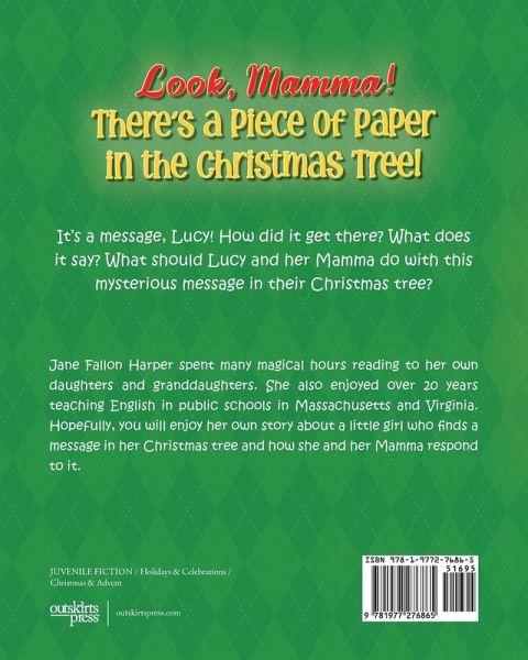 A Message in the Christmas Tree is Jane Fallon Harper's debut children's story about a young mother and her five your old daughter's discovery of a written request in their Christmas Tree. Readers will learn about the heart-warming message they find and how Lucy and her mother respond to it. The story was inspired by her own daughter and her first child, Lucy. Jane Fallon Harper taught English for over 20 years in public schools in Massachusetts and Virginia. She was also a certified Reading specialist, an accomplishment inspired by her own brother's struggle with dyslexia. Jane passionately believes that reading to children and their subsequent ability to read equips them with a life-long opportunity to learn, to discover and to enjoy the magic of literature.