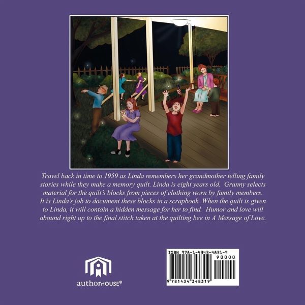 Travel back in time to 1959 as Linda remembers her grandmother telling family stories while they make a memory quilt. Linda is eight years old. Granny selects material for the quilt's blocks from pieces of clothing worn by family members. It is Linda's job to document these blocks in a scrapbook. When the quilt is given to Linda, it will contain a hidden message for her to find. Humor and love will abound right up to the final stitch taken at the quilting bee in A Message of Love.