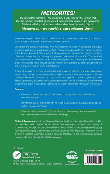 Richard Greenwood is a Senior Research Fellow at the Open University, UK. A geologist by training, he started studying meteorites quite by accident after answering an advert in a science magazine. Life has never been quite the same since. Some of his close encounters with extraterrestrial rocks are described in this book. In particular, he was the first scientist to identify the Winchcombe meteorite. But things haven't always gone totally to plan. Failure to find a single space rock on a Moroccan expedition in the 1990s still hurts. Full disclosure is provided here. Richard's more academic activities involve the study of meteorites with the aim of understanding the origin and early evolution of our Solar System. Spacecraft are now collecting material directly from asteroids and bringing the samples back to Earth. Richard has been at the heart of these activities, working with international teams analyzing material brought back by the Japanese Space Agency (JAXA) from asteroid Ryugu and by the NASA OSIRIS-REx mission from Asteroid Bennu. He also maintains a popular outreach blog on meteorites: https://meteoritestheblog.com/.