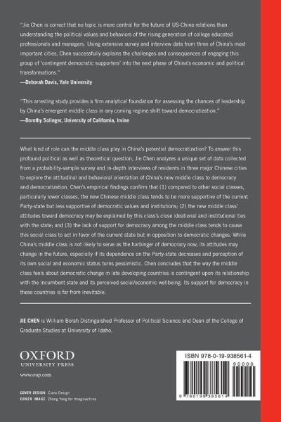 What kind of role can the middle class play in potential democratization in such an undemocratic, late developing country as China? To answer this profound political as well as theoretical question, Jie Chen explores attitudinal and behavioral orientation of China's new middle class to democracy and democratization. Chen's work is based on a unique set of data collected from a probability-sample survey and in-depth interviews of residents in three major Chinese cities, Beijing, Chengdu and Xi'an--each of which represents a distinct level of economic development in urban China-in 2007 and 2008. The empirical findings derived from this data set confirm that (1) compared to other social classes, particularly lower classes, the new Chinese middle class-especially those employed in the state apparatus-tends to be more supportive of the current Party-state but less supportive of democratic values and institutions; (2) the new middle class's attitudes toward democracy may be accounted for by this class's close ideational and institutional ties with the state, and its perceived socioeconomic wellbeing, among other factors; (3) the lack of support for democracy among the middle class tends to cause this social class to act in favor of the current state but in opposition to democratic changes. The most important political implication is that while China's middle class is not likely to serve as the harbinger of democracy now, its current attitudes toward democracy may change in the future. Such a crucial shift in the middle class's orientation toward democracy can take place, especially when its dependence on the Party-state decreases and perception of its own social and economic statuses turns pessimistic. The key theoretical implication from the findings suggests that the attitudinal and behavioral orientations of the middle class-as a whole and as a part-toward democratic change in late developing countries are contingent upon its with the incumbent state and its perceived social/economic wellbeing, and the middle class's support for democracy in these countries is far from inevitable.