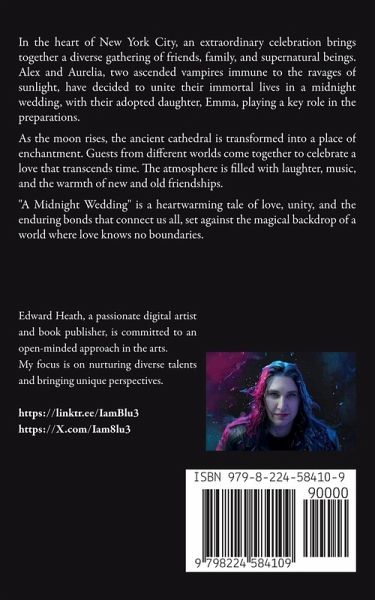 In the heart of New York City, an extraordinary celebration brings together a diverse gathering of friends, family, and supernatural beings. Alex and Aurelia, two ascended vampires immune to the ravages of sunlight, have decided to unite their immortal lives in a midnight wedding, with their adopted daughter, Emma, playing a key role in the preparations. As the moon rises, the ancient cathedral is transformed into a place of enchantment. Guests from different worlds come together to celebrate a love that transcends time. The atmosphere is filled with laughter, music, and the warmth of new and old friendships. "A Midnight Wedding" is a heartwarming tale of love, unity, and the enduring bonds that connect us all, set against the magical backdrop of a world where love knows no boundaries.