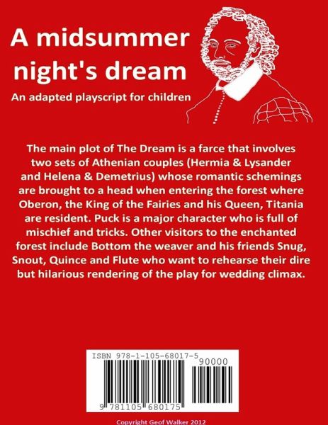 The main plot of The Dream is a farce that involves two sets of Athenian couples (Hermia & Lysander and Helena & Demetrius) whose romantic schemings are brought to a head when entering the forest where Oberon, the King of the Fairies and his Queen, Titania are resident. Puck is a major character who is full of mischief and tricks. Other visitors to the enchanted forest include Bottom the weaver and his friends Snug, Snout, Quince and Flute who want to rehearse their dire but hilarious rendering of the play for wedding climax. Geof Walker, retired headteacher, produced Shakespeare comedies at his school to great effect and decided to turn the success into scripts available for others. Here is the recently revised script of The Dream.