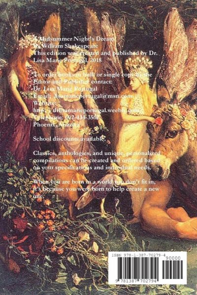 A Midsummer Night's Dream By William Shakespeare This edition was created and published by Dr. Lisa Marie Portugal, 2018 To order books in bulk or single copy by the Editor and Publisher contact: Dr. Lisa Marie Portugal Email: lisamarieportugal@msn.com Websites: Find Dr. Lisa Marie Portugal on Lulu & Weebly Telephone: 602-434-3562 Phoenix, Arizona School discounts available. Classics, anthologies, and unique, personalized compilations can be created and ordered based on your specifications and individual needs. When you are born in a world you donÕt fit in, itÕs because you were born to help create a new one.