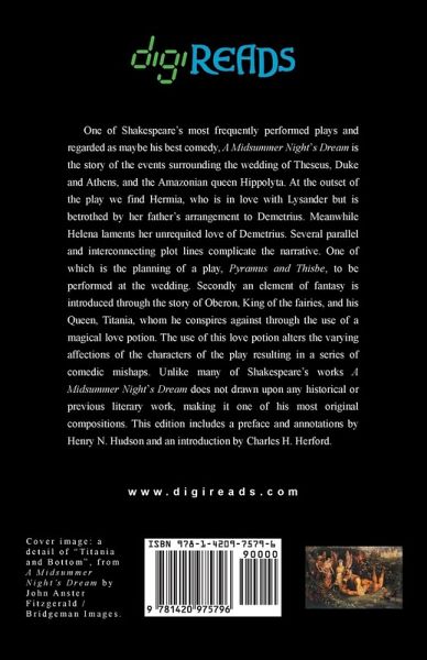 One of Shakespeare's most frequently performed plays and regarded as maybe his best comedy, "A Midsummer Night's Dream" is the story of the events surrounding the wedding of Theseus, Duke and Athens, and the Amazonian queen Hippolyta. At the outset of the play we find Hermia, who is in love with Lysander but is betrothed by her father's arrangement to Demetrius. Meanwhile Helena laments her unrequited love of Demetrius. Several parallel and interconnecting plot lines complicate the narrative. One of which is the planning of a play, "Pyramus and Thisbe", to be performed at the wedding. Secondly an element of fantasy is introduced through the story of Oberon, King of the fairies, and his Queen, Titania, whom he conspires against through the use of a magical love potion. The use of this love potion alters the varying affections of the characters of the play resulting in a series of comedic mishaps. Unlike many of Shakespeare's works "A Midsummer Night's Dream" does not drawn upon any historical or previous literary work, making it one of his most original compositions. This edition is printed on premium acid-free paper, includes a preface and annotations by Henry N. Hudson, and an introduction by Charles H. Herford.