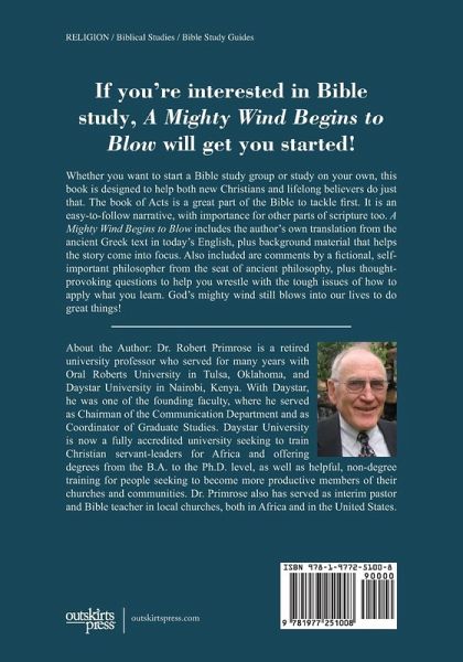 Whether you want to start a Bible study group or study on your own, this book is designed to help both new Christians and lifelong believers do just that. The book of Acts is a great part of the Bible to tackle first. It is an easy-to-follow narrative, with importance for other parts of scripture too. A Mighty Wind Begins to Blow includes the author's own translation from the ancient Greek text in today's English, plus background material that helps the story come into focus. Also included are comments by a fictional, self-important philosopher from the seat of ancient philosophy, plus thought-provoking questions to help you wrestle with the tough issues of how to apply what you learn. God's mighty wind still blows into our lives to do great things!