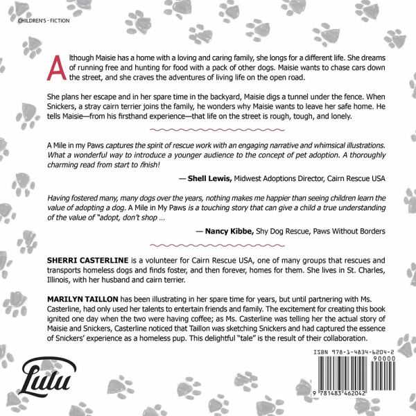 Although Maisie has a home with loving and caring humans, she longs for a different life. She dreams of running free, hunting for food with a pack of other dogs, and howling at the moon. She craves the adventures of living life on the open road. She plans her escape and in her spare time in the backyard, Maisie digs a tunnel under the fence. When Snickers, a stray cairn terrier joins the family, he wonders why Maisie wants to leave her safe home. He tells Maisie-from his firsthand experience-that life on the street is rough, tough, and lonely. "A Mile in my Paws captures the spirit of rescue work with an engaging narrative and whimsical illustrations. What a wonderful way to introduce a younger audience to the concept of pet adoption. A thoroughly charming read from start to finish!" - Shell Lewis, Midwest Adoptions Director, Cairn Rescue USA
