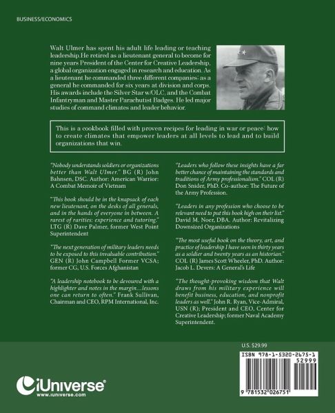 Within formal organizations like the military, individuals in charge rely on two sources of authority to get the job done: granted statutory power and personal power, which is gained by earning trust. Good leaders use both. In A Military Leadership Notebook, Walter F. Ulmer Jr., who retired from the U.S. Army as a lieutenant general, explores what makes a great commander. While he focuses on the military, the leadership lessons he shares work in war and peace, on land and at sea, and in small and large organizations. Ulmer defines leadership, shares his personal philosophy of leadership, reveals tips on measuring a leaders success, and outlines behaviors that can lead to successas well as those that can lead to disaster. He also wades into the debate over whether leaders are born or made, explains why its important to respect the authority and responsibility of subordinate leaders, and how to manage organizations and large staffs. No matter what your military rankand even if youre a civilian leaderthis guide will be a leadership teaching tool that youll refer to for years to come.