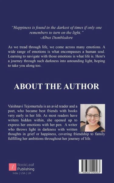 """Happiness is found in the darkest of times if only one remembers to turn on the light." -Albus Dumbledore As we tread through life, we come across many emotions. A wide range of emotions is what encompasses a human soul. Learning to navigate with those emotions is what life is. Here's a journey through such darkness into astounding light, hoping to take you along too.""