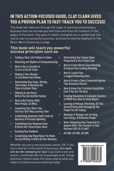 IN THIS ACTION-FOCUSED GUIDE, CLAY CLARK GIVES YOU A PROVEN PLAN TO FAST-TRACK YOU TO SUCCESS! This book will walk you through the steps of starting and growing a business that can provide you with time and financial freedom! In the pages of this book, Clay goes in-depth, and gives you a candid look into how to start a successful business, and how he started Elephant In The Room Men's Grooming Lounge. This book will teach you powerful success principles such as: Finding a Real-Life Problem to Solve Mastering the Rhythm of Entrepreneurship How to Use a Calendar & To-Do List At All Times Making It Your Mission To Live Below Your Means Determining Your Goals, Writing Them Down, & Blocking Out Time to Achieve Them Waking Up Two Hours Before You See Another Human How to Not Partner With Most People, (& Why)... Determining Your Unique Value Proposition & Your Purple Cow How to Create World-Class Branding & Improve Your Existing Branding How to Launch Your 4-Legged Marketing Stool How to Create a Sales Conversion System That Generates Results How to Know Your Customer Acquisition Cost If You Are The Boss Creating Repeatable & Scaleable Systems to WOW Your Ideal & Likely Buyers Learning to Manage Effectively, Or Find Yourself Being Held Hostage By The People You Are Paying Converting Your Drive Time Into Your Self-Help Learning Time Establishing Separate Credit Cards for Business & Personal Spending Establishing Your Revenue Goals & Knock Out These Action Items Refusing to Manage Late-Arriving, Low-Energy, & Nefarious People Never Delegating Your Financials to Anyone Other Than Yourself, or Your Business Will Go To Hell! ACTION. ACTION. ACTION. Whether you are a new business owner, OR, if you are a veteran in the world of business, this book will be life-changing for you! Clay Clark's wit and humor, combined with his knowledge of all-things business related make this book exactly what you need to achieve success starting today!