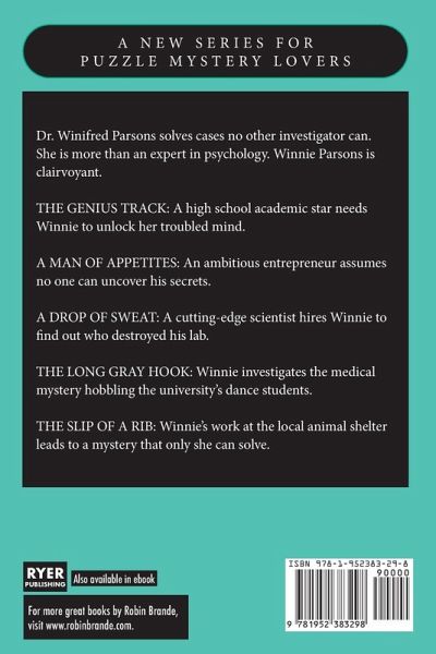 A Winnie Parsons Mystery Collection. Retired psychology professor Dr. Winifred Parsons spent decades studying the human psyche as a scientist and academic. But she also explored it from another angle: Winnie Parsons is clairvoyant. Now Winnie uses her psychic talent to help clients resolve mysteries that are outside the reach of standard investigations. The path to justice might be twisted, but Winnie always finds a way. A MIND FOR MYSTERIES includes five original Winnie Parsons mysteries: THE GENIUS TRACK: A high school academic star needs Winnie to unlock her troubled mind. A MAN OF APPETITES: An ambitious entrepreneur assumes no one can uncover his secrets. A DROP OF SWEAT: A cutting-edge scientist hires Winnie to find out who destroyed his lab. THE LONG GRAY HOOK: Winnie investigates the medical mystery hobbling the university's dance students. THE SLIP OF A RIB: Winnie's work at the local animal shelter leads to a mystery that only she can solve. Don't miss the newest Winnie Parsons Mystery Novel, THE SECRET JUROR.