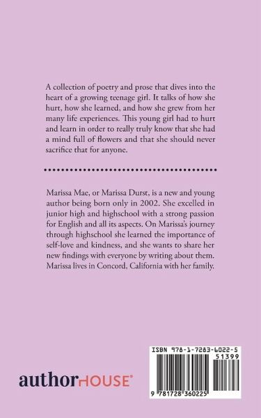 A collection of poetry and prose that dives into the heart of a growing teenage girl. It talks of how she hurt, how she learned, and how she grew from her many life experiences. This young girl had to hurt and learn in order to really truly know that she had a mind full of flowers and that she should never sacrifice that for anyone.