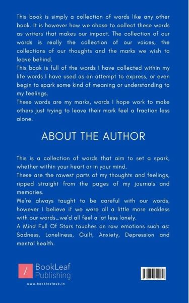 ""This book is simply a collection of words like any other book. It is however how we chose to collect these words as writers that makes our impact. The collection of our words is really the collection of our voices, the collections of our thoughts and the marks we wish to leave behind. This book is full of the words I have collected within my life words I have used as an attempt to express, or even begin to spark some kind of meaning or understanding to my feelings. These words are my marks, words I hope work to make others just trying to leave their mark feel a fraction less alone.""