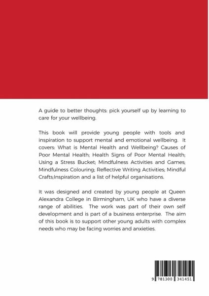 A guide to better thoughts: pick yourself up by learning to care for your wellbeing. This book will provide young people with tools and inspiration to support mental and emotional wellbeing. It covers: What is Mental Health and Wellbeing? Causes of Poor Mental Health; Health Signs of Poor Mental Health; Using a Stress Bucket; Mindfulness Activities and Games; Mindfulness Colouring; Reflective Writing Activities; Mindful Crafts; Inspiration and a list of helpful organisations. It was designed and created by young people at Queen Alexandra College in Birmingham, UK who have a diverse range of abilities. The work was part of their own self development and is part of a business enterprise. The aim of this book is to support other young adults with complex needs who may be facing worries and anxieties.