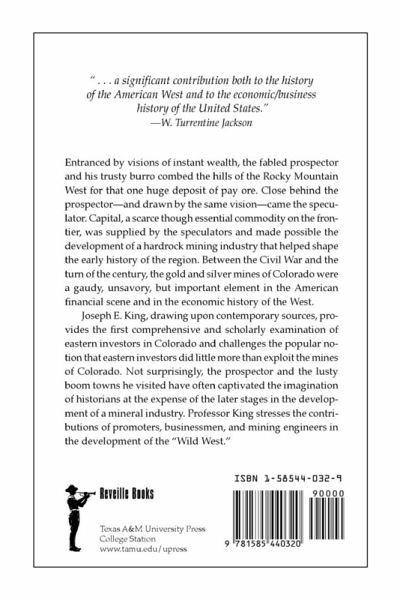 Entranced by visions of instant wealth, the fabled prospector and his trusty burro combed the hills of the Rocky Mountain West for that one huge deposit of pay ore. Close behind the prospector--and drawn by the same vision--came the speculator. Capital, a scarce though essential commodity on the frontier, was supplied by the speculators and made possible the development of a hardrock mining industry that helped shape the early history of the region. Between the Civil War and the turn of the century, the gold and silver mines of Colorado were a gaudy, unsavory, but important element in the American financial scene and in the economic history of the West. Joseph E. King, drawing upon contemporary sources, provides the first comprehensive and scholarly examination of eastern investors in Colorado and challenges the popular notion that eastern investors did little more than exploit the mines of Colorado. Not surprisingly, the prospector and the lusty boom towns he visited have often captivated the imagination of historians at the expense of the later stages in the development of a mineral industry. Professor King stresses the contributions of promoters, businessmen, and mining engineers in the development of the "Wild West."