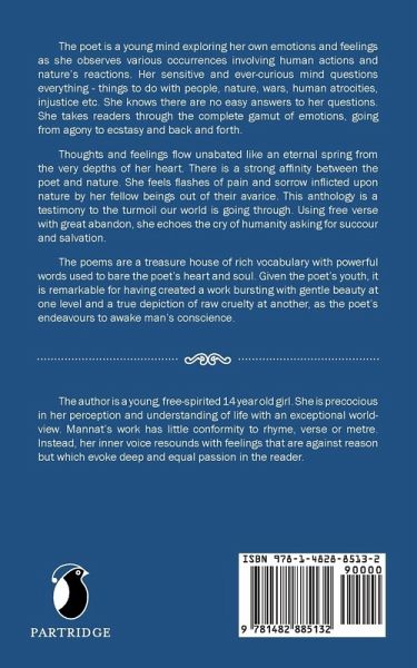 The poet is a young mind exploring her own emotions and feelings as she observes various occurrences involving human actions and nature's reactions. Her sensitive and ever-curious mind questions everything - things to do with people, nature, wars, human atrocities, injustice etc. She knows there are no easy answers to her questions. She takes readers through the complete gamut of emotions, going from agony to ecstasy and back and forth. Thoughts and feelings flow unabated like an eternal spring from the very depths of her heart. There is a strong affinity between the poet and nature. She feels flashes of pain and sorrow inflicted upon nature by her fellow beings out of their avarice. This anthology is a testimony to the turmoil our world is going through. Using free verse with great abandon, she echoes the cry of humanity asking for succour and salvation. The poems are a treasure house of rich vocabulary with powerful words used to bare the poet's heart and soul. Given the poet's youth, it is remarkable for having created a work bursting with gentle beauty at one level and a true depiction of raw cruelty at another, as the poet's endeavours to awake man's conscience.