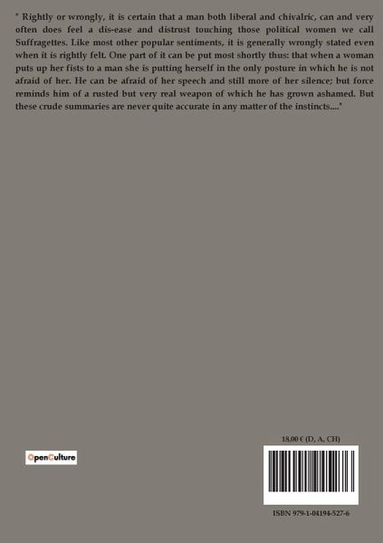 " Rightly or wrongly, it is certain that a man both liberal and chivalric, can and very often does feel a dis-ease and distrust touching those political women we call Suffragettes. Like most other popular sentiments, it is generally wrongly stated even when it is rightly felt. One part of it can be put most shortly thus: that when a woman puts up her fists to a man she is putting herself in the only posture in which he is not afraid of her. He can be afraid of her speech and still more of her silence; but force reminds him of a rusted but very real weapon of which he has grown ashamed. But these crude summaries are never quite accurate in any matter of the instincts...."
