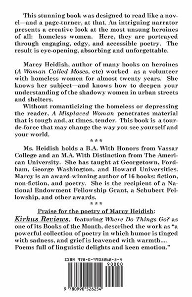 This stunning book was designed to read like a novel—and a page-turner, at that. An intriguing narrator presents a creative look at the most unsung heroines of all: homeless women. Here, they are portrayed through engaging, edgy, and accessible poetry. The result is eye-opening, absorbing and unforgettable. Marcy Heidish, author of many books on heroines (A Woman Called Moses, etc) worked as a volunteer with homeless women for almost twenty years. She knows her subject—and knows how to deepen your understanding of the shadowy women in urban streets and shelters. Without romanticizing the homeless or depressing the reader, A Misplaced Woman penetrates material that is tough and, at times, tender. This book is a tour-de-force that may change the way you see yourself and your world. * * * Ms. Heidish holds a B.A. With Honors from Vassar College and an M.A. With Distinction from The American University. She has taught at Georgetown, Fordham, George Washington, and Howard Universities. Marcy is an award-winning author of 16 books: fiction, non-fiction, and poetry. She is the recipient of a National Endowment Fellowship Grant, a Schubert Fellowship, and other awards. * * * Praise for the poetry of Marcy Heidish: Kirkus Reviews, featuring Where Do Things Go? as one of its Books of the Month, described the work as "a powerful collection of poetry in which humor is tinged with sadness, and grief is leavened with warmth.... Poems full of linguistic delights and keen emotion."