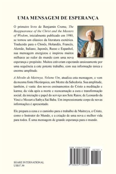 O primeiro livro de Benjamin Creme, The Reappearance of the Christ and the Masters of Wisdom, inicialmente publicado em 1980, se tornou um clássico da literatura esotérica. Traduzido para o Chinês, Holandês, Francês, Alemão, Italiano, Japonês, Russo e Espanhol, sua mensagem energizou e inspirou muitos milhares ao redor do mundo com uma nova esperança e propósito. Muitos estiveram esperando ansiosamente por uma sequência a este potente trabalho, com sua informação única e enorme amplitude. A Missão de Maitreya, Volume Um, atualiza esta mensagem, e vem da mesma fonte Hierárquica, um Mestre da Sabedoria. Sua amplitude, também, é vasta: dos novos ensinamentos do Cristo a meditação e karma; da vida após a morte e reencarnação a cura e transformação social; da iniciação e papel do serviço aos Sete Raios; de Leonardo da Vinci e Mozart a Sathya Sai Baba. Um impressionante corpo de novas informações é apresentado. Ele prepara a cena e o caminho para o trabalho de Maitreya, o Cristo, como o Instrutor do Mundo, e a criação de uma nova e melhor vida para todos. É uma mensagem de grande esperança para o mundo.