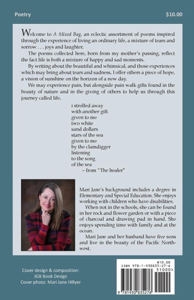Welcome to A Mixed Bag, an eclectic assortment of poems inspired through the experience of living an ordinary life, a mixture of tears and sorrow . . . joys and laughter. The poems collected here, born from my mother's passing, reflect the fact life is both a mixture of happy and sad moments. By writing about the beautiful and whimsical, and those experiences which may bring about tears and sadness, I offer others a piece of hope, a vision of sunshine on the horizon of a new day. We may experience pain, but alongside pain walk gifts found in the beauty of nature and in the giving of others to help us through this journey called life.