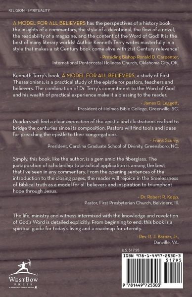 Paul was writing to this fledgling church giving them encouragement and hope in a world that seemed hopeless for their continued existence. In spite of their negative circumstances this young church was being a model to all believers throughout their world. Here is help and hope for your world. "A Model for All Believers" has the perspectives of a history book, the insights of a commentary, the style of a devotional, the flow of a novel, the readability of a magazine, and the content of the Word of God! It is the best of many literary worlds! Author Kenneth Terry writes masterfully in a style that makes a 1st Century book come alive with 21st Century relevance! Presiding Bishop Ronald D. Carpenter, International Pentecostal Holiness Church, Oklahoma City, OK. Kenneth Terry's book, A MODEL FOR ALL BELIEVERS, a study of First Thessalonians, is a practical study of the epistle for pastors, teachers and believers. The combination of Dr. Terry's commitment to the Word of God and his wealth of practical experience make a blessing to the reader. James D. Leggett, President of Holmes Bible College, Greenville, SC. Readers will find a clear exposition of the epistle and illustrations crafted to bridge the centuries since its composition. Pastors will find tools and ideas for preaching the epistle to their congregations. Frank Scurry, President, Carolina Graduate School of Divinity, Greensboro, NC. Simply, this book, like the author, is a gem amid the fiberglass. The juxtaposition of scholarship to practical application is among the best that I've seen in any commentary. From the opening sentences of the introduction to the closing pages, the reader will rejoice in the timelessness of Biblical truth as a model for all believers and inspiration to triumphant hope through Jesus. Dr. Robert R. Kopp, Pastor, First Presbyterian Church, Belvidere, Ill. The life, ministry and witness intermixed with the knowledge and revelation of God's Word is detailed explicitly. From beginning to end, this book is a spiritual guide for today's living and a roadmap for eternity. Rev. R. J. Barber, Jr., Danville, VA.