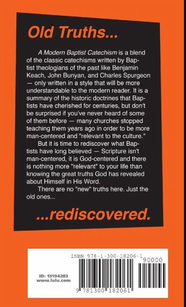 A Modern Baptist Catechism is a blend of the classic catechisms written by Baptist theologians of the past like Benjamin Keach, John Bunyan, and Charles Spurgeon - only written in a style that will be more understandable to the modern reader. It is a summary of the historic doctrines that Baptists have cherished for centuries, but don't be surprised if you've never heard of some of them before - many churches stopped teaching them years ago in order to be more man-centered and "relevant to the culture." But it is time to rediscover what Baptists have long believed - Scripture isn't man-centered, it is God-centered and there is nothing more "relevant" to your life than knowing the great truths God has revealed about Himself in His Word. There are no "new" truths here. Just the old ones rediscovered.