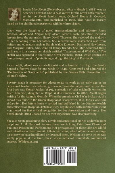 Louisa May Alcott (November 29, 1832 – March 6, 1888) was an American novelist. She is best known for the novel Little Women, set in the Alcott family home, Orchard House in Concord, Massachusetts, and published in 1868. This novel is loosely based on her childhood experiences with her three sisters. Alcott was the daughter of noted transcendentalist and educator Amos Bronson Alcott and Abigail May Alcott. Alcott's early education included lessons from the naturalist Henry David Thoreau. She received the majority of her schooling from her father. She received some instruction also from writers and educators such as Ralph Waldo Emerson, Nathaniel Hawthorne, and Margaret Fuller, who were all family friends. She later described these early years in a newspaper sketch entitled "Transcendental Wild Oats." The sketch was reprinted in the volume Silver Pitchers (1876), which relates the family's experiment in "plain living and high thinking" at Fruitlands. As an adult, Alcott was an abolitionist and a feminist. In 1847, the family housed a fugitive slave for one week. In 1848, Alcott read and admired the "Declaration of Sentiments" published by the Seneca Falls Convention on women's rights. Poverty made it necessary for Alcott to go to work at an early age as an occasional teacher, seamstress, governess, domestic helper, and writer. Her first book was Flower Fables (1849), a selection of tales originally written for Ellen Emerson, daughter of Ralph Waldo Emerson. In 1860, Alcott began writing for the Atlantic Monthly. When the American Civil War broke out, she served as a nurse in the Union Hospital at Georgetown, D.C., for six weeks in 1862-1863. Her letters home – revised and published in the Commonwealth and collected as Hospital Sketches (1863, republished with additions in 1869) – garnered her first critical recognition for her observations and humor. Her novel Moods (1864), based on her own experience, was also promising. She also wrote passionate, fiery novels and sensational stories under the nom de plume A. M. Barnard. Among these are A Long Fatal Love Chase and Pauline's Passion and Punishment. Her protagonists for these tales are willful and relentless in their pursuit of their own aims, which often include revenge on those who have humiliated or thwarted them. Written in a style which was wildly popular at the time, these works achieved immediate commercial success. (Wikipedia.org)