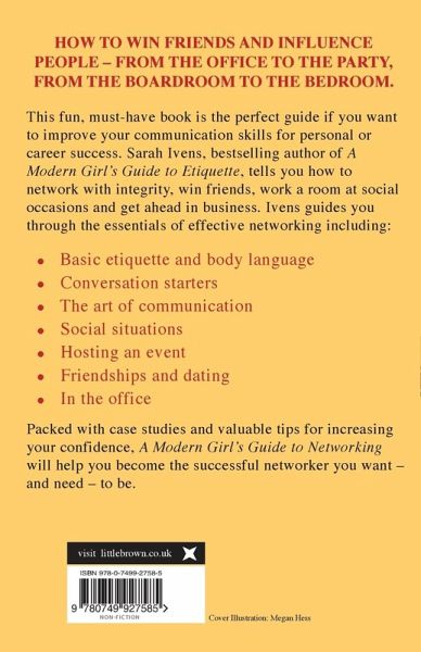 In this fun, info-packed guide, Sarah Ivens, bestselling author of A Modern Girl's Guide to Etiquette, tells you how to network with integrity, how to win friends, work a room at social occasions and get ahead in business. Ideas to improve your confidence along with case studies of successful networkers will help you become the successful woman you want to be. Topics covered include: Basic etiquette and body language; Conversation starters; The art of communication; Social situations; Hosting an event; Friendships and dating; In the office.