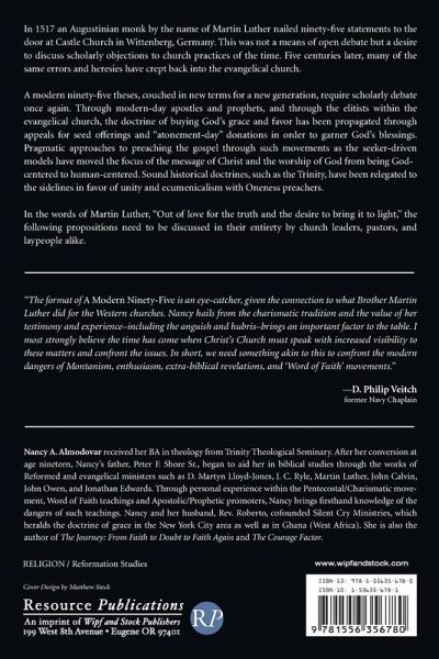 In 1517 an Augustinian monk by the name of Martin Luther nailed ninety-five statements to the door at Castle Church in Wittenberg, Germany. This was not a means of open debate but a desire to discuss scholarly objections to church practices of the time. Five centuries later, many of the same errors and heresies have crept back into the evangelical church. A modern ninety-five theses, couched in new terms for a new generation, require scholarly debate once again. Through modern-day apostles and prophets, and through the elitists within the evangelical church, the doctrine of buying God's grace and favor has been propagated through appeals for seed offerings and ""atonement-day"" donations in order to garner God's blessings. Pragmatic approaches to preaching the gospel through such movements as the seeker-driven models have moved the focus of the message of Christ and the worship of God from being God-centered to human-centered. Sound historical doctrines, such as the Trinity, have been relegated to the sidelines in favor of unity and ecumenicalism with Oneness preachers. In the words of Martin Luther, ""Out of love for the truth and the desire to bring it to light,"" the following propositions need to be discussed in their entirety by church leaders, pastors, and laypeople alike.