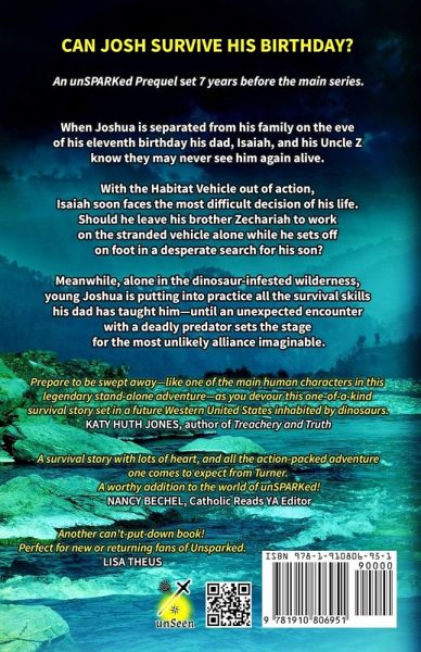 CAN JOSH SURVIVE HIS BIRTHDAY? An unSPARKed prequel set 7 years before the main series. When Joshua is separated from his family on the eve of his eleventh birthday his dad, Isaiah, and his Uncle Z know they may never see him again alive. With the Habitat Vehicle out of action, Isaiah soon faces the most difficult decision of his life. Should he leave his brother Zechariah to work on the stranded vehicle alone while he sets off on foot in a desperate search for his son? Meanwhile, alone in the dinosaur-infested wilderness, young Joshua is putting into practice all the survival skills his dad has taught him-until an unexpected encounter with a deadly predator sets the stage for the most unlikely alliance imaginable. The unSPARKed series: CAN HUMANS AND DINOSAURS CO-EXIST? In a Jurassic future, humans no longer have dominion over the earth. Most people live in cities, behind high electric fences, but some choose the freedom of life unSPARKed, close to nature. If you like Jurassic Park, Jurassic World, and Mad Max, you'll love this pulse-pounding, futuristic, dino-dystopian series with a western twist. Since 2017, award-winning author Corinna Turner has been writing the unSPARKed series. Check it out today!