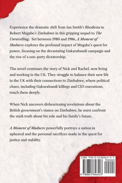 Experience the dramatic shift from Ian Smith's Rhodesia to Robert Mugabe's Zimbabwe in this gripping sequel to The Unravelling. Set between 1980 and 1986, A Moment of Madness delves into the profound impact of Mugabe's consolidation of power, focusing on the devastating Gukurahundi campaign and the rise of a brutal one-party dictatorship. The novel continues the story of Nick and Rachel, familiar characters from the first book. Living in the UK, engaged in September 1982, and married in 1984, their love story unfolds amidst political chaos. As they return to Zimbabwe for their honeymoon, they face personal challenges and the broader implications of Mugabe's ruthless regime. In the UK, Nick witnesses the cold-blooded tactics of Zimbabwe's Central Intelligence Organisation (CIO) when Jonathan Khumalo, a young lawyer with alleged royal Ndebele ties, is eliminated as a perceived threat to Mugabe's ambitions. Meanwhile, in Zimbabwe, Sipho Pukelo, Nick's comrade-in-arms, faces similar violence when a 5th Brigade assault squad, led by Major Tawanda Nyati, raids his village, killing his parents. Later, Nyati himself becomes a liability and is murdered by the CIO. Back in the UK, Nick joins Rare Quest Imports Pty Ltd (RQI), owned by his father-in-law. His expertise proves crucial in covert arms deals with South Africa, aimed at countering guerrilla movements and communist factions, providing him with deeper insights into the complex world of Cold War geopolitics. As Nick uncovers disheartening revelations about the British government's stance on Zimbabwe, he faces a profound personal dilemma. With Rachel's pregnancy adding new dimensions to his life, Nick must balance his commitment to his family in the UK with his desire to help Zimbabwe amidst increasing repression. A Moment of Madness vividly portrays the Gukurahundi campaign and Mugabe's quest for absolute power, offering a powerful exploration of this tumultuous period in Zimbabwe's history. Dive into a tale of love, conflict, and political intrigue with lasting impact.