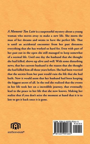 A Moment to Late is a suspenseful mystery about a young woman who moves away to make a new life. Meets the man of her dreams and seems to have the perfect life. That is until a accidental encounter from her past threatens everything that she worked so hard for. Even with a part of her past out in the open she still managed to keep somewhat of a normal life. Until one day the husband that she thought she had killed, shows up alive and well. She had been worried that the secrets from her past would ruin the life that she had built. Only to find out that her husband was keeping the biggest secret of all.