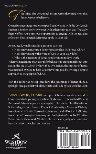 This thirty-day devotional encompasses the entire letter that James wrote to believers. Geared to encourage readers to spend quality time with the Lord, each chapter is broken down by verses with a theme for each day. The daily theme offers you a precious opportunity to engage with the text and reflect on how selected Scriptures apply to your life. As you read, you'll consider questions such as: ¿ How can you nurture a deeper relationship with Jesus Christ? ¿ How can you apply the word of God in your daily life? ¿ Why is the message of James so relevant to today's world? What we need more than ever is for believers to authentically put into action the life of Christ by how they live. James, the brother of Jesus, was inspired by God to help us achieve this goal by writing a simple approach to the gospel of Christ. Join the author as he explores how the teachings of James shine a spotlight on a path that will allow you to walk side by side with the Lord.