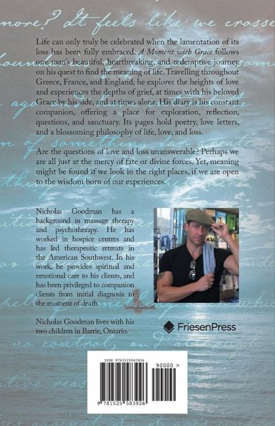 Life can only truly be celebrated when the lamentation of its loss has been fully embraced. A Moment with Grace follows one man's beautiful, heartbreaking, and redemptive journey on his quest to find the meaning of life. Travelling throughout Greece, France, and England, he explores the heights of love and experiences the depths of grief, at times with his beloved Grace by his side, and at times alone. His diary is his constant companion, offering a place for exploration, reflection, questions, and sanctuary. Its pages hold poetry, love letters, and a blossoming philosophy of life, love, and loss. Are the questions of love and loss unanswerable? Perhaps we are all just at the mercy of fate or divine forces. Yet, meaning might be found if we look in the right places, if we are open to the wisdom born of our experiences.