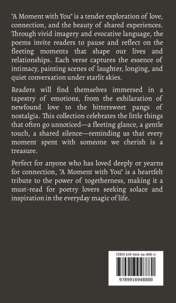 "A Moment with You" is a tender exploration of love, connection, and the beauty of shared experiences. Through vivid imagery and evocative language, the poems invite readers to pause and reflect on the fleeting moments that shape our lives and relationships. Each verse captures the essence of intimacy, painting scenes of laughter, longing, and quiet conversation under starlit skies. Readers will find themselves immersed in a tapestry of emotions, from the exhilaration of newfound love to the bittersweet pangs of nostalgia. This collection celebrates the little things that often go unnoticed-a fleeting glance, a gentle touch, a shared silence-reminding us that every moment spent with someone we cherish is a treasure. Perfect for anyone who has loved deeply or yearns for connection, "A Moment with You" is a heartfelt tribute to the power of togetherness, making it a must-read for poetry lovers seeking solace and inspiration in the everyday magic of life.