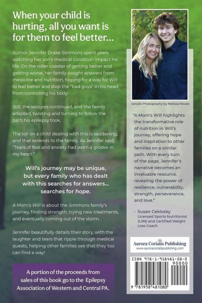 When your child is hurting, all you want is for them to feel better ... Author Jennifer Drake Simmons spent years watching her son's medical condition impact his life. On the roller coaster of getting better and getting worse, her family sought answers from medicine and nutrition, hoping for a way for Will to feel better and stop the "bad guys" in his head from controlling his body. Still, the seizures continued, and the family adapted, twisting and turning to follow the path his epilepsy took. The toll on a child dealing with this is saddening, and that extends to the family. As Jennifer said, "Tears of fear and anxiety had worn a groove in my heart." Will's journey may be unique, but every family who has dealt with this searches for answers, searches for hope. A Mom's Will is about the Simmons family's journey, finding strength, trying new treatments, and eventually coming out of the storm. Jennifer beautifully details their story, with the laughter and tears that ripple through medical quests, helping other families see that they too can find a way! A portion of the proceeds from sales of this book go toward the Epilepsy Association.