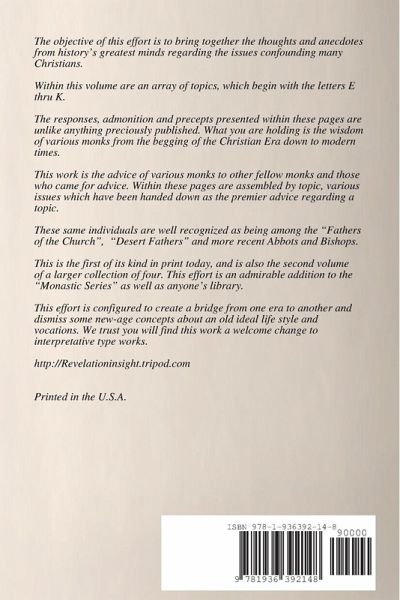 The objective of this effort is to bring together the thoughts and anecdotes from history's greatest minds regarding the issues confounding many Christians. Within this volume are an array of topics, which begin with the letters E thru K. The responses, admonition and precepts presented within these pages are unlike anything preciously published. What you are holding is the wisdom of various monks from the begging of the Christian Era down to modern times.This work is the advice of various monks to other fellow monks and those who came for advice. Within these pages are assembled by topic, various issues which have been handed down as the premier advice regarding a topic. These same individuals are well recognized as being among the "Fathers of the Church", "Desert Fathers" and more recent Abbots and Bishops. This is the first of its kind in print today, and is also the second volume of a larger collection of four.