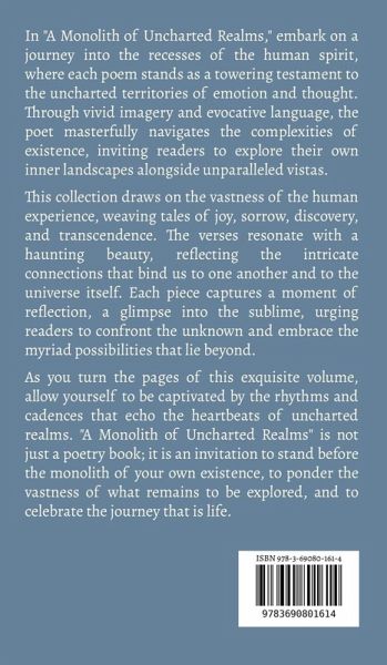 In "A Monolith of Uncharted Realms," embark on a journey into the recesses of the human spirit, where each poem stands as a towering testament to the uncharted territories of emotion and thought. Through vivid imagery and evocative language, the poet masterfully navigates the complexities of existence, inviting readers to explore their own inner landscapes alongside unparalleled vistas. This collection draws on the vastness of the human experience, weaving tales of joy, sorrow, discovery, and transcendence. The verses resonate with a haunting beauty, reflecting the intricate connections that bind us to one another and to the universe itself. Each piece captures a moment of reflection, a glimpse into the sublime, urging readers to confront the unknown and embrace the myriad possibilities that lie beyond. As you turn the pages of this exquisite volume, allow yourself to be captivated by the rhythms and cadences that echo the heartbeats of uncharted realms. "A Monolith of Uncharted Realms" is not just a poetry book; it is an invitation to stand before the monolith of your own existence, to ponder the vastness of what remains to be explored, and to celebrate the journey that is life.