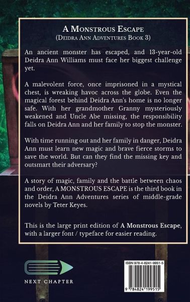 An ancient monster has escaped, and 13-year-old Deidra Ann Williams must face her biggest challenge yet. A malevolent force, once imprisoned in a mystical chest, is wreaking havoc across the globe. Even the magical forest behind Deidra Ann's home is no longer safe. With her grandmother Granny mysteriously weakened and Uncle Abe missing, the responsibility falls on Deidra Ann and her family to stop the monster. With time running out and her family in danger, Deidra Ann must learn new magic and brave fierce storms to save the world. But can they find the missing key and outsmart their adversary? A story of magic, family and the battle between chaos and order, A MONSTROUS ESCAPE is the third book in the Deidra Ann Adventures series of middle-grade novels by Teter Keyes. This is the large print edition of A Monstrous Escape, with a larger font / typeface for easier reading.