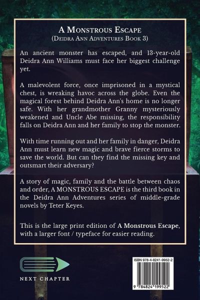An ancient monster has escaped, and 13-year-old Deidra Ann Williams must face her biggest challenge yet. A malevolent force, once imprisoned in a mystical chest, is wreaking havoc across the globe. Even the magical forest behind Deidra Ann's home is no longer safe. With her grandmother Granny mysteriously weakened and Uncle Abe missing, the responsibility falls on Deidra Ann and her family to stop the monster. With time running out and her family in danger, Deidra Ann must learn new magic and brave fierce storms to save the world. But can they find the missing key and outsmart their adversary? A story of magic, family and the battle between chaos and order, A MONSTROUS ESCAPE is the third book in the Deidra Ann Adventures series of middle-grade novels by Teter Keyes. This is the large print edition of A Monstrous Escape, with a larger font / typeface for easier reading.