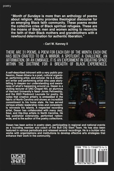 Poetry collection by Dasan Ahanu. Ahanu is an award-winning poet and performance artist, public speaker, community organizer, educator, scholar and emcee born and raised in Raleigh, North Carolina. He is an Alumni Nasir Jones Fellow at Harvard's Hip Hop Archive and Research Institute, resident artist at the St. Joseph's Historic Foundation/Hayti Heritage Center, and visiting lecturer at the University of North Carolina-Chapel Hill. He has performed across the country, appeared on national radio and TV, published three books of poetry, been featured in various periodicals and released numerous recordings. He works with organizations and institutions to develop effective arts strategies to enhance their work in the community. Dasan is currently managing a grant funded initiative as the Rothwell Mellon Program Director for Creative Futures with Carolina Performing Arts. He swings a mean pen and represents the SOUTH.