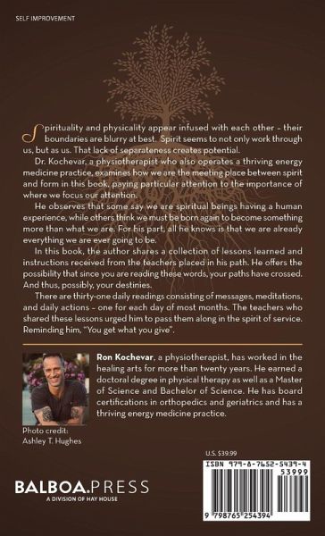 Spirituality and physicality appear infused with each other - their boundaries are blurry at best. Spirit seems to not only work through us, but as us. That lack of separateness creates potential. Dr. Kochevar, a physiotherapist who also operates a thriving energy medicine practice, examines how we are the meeting place between spirit and form in this book, paying particular attention to the importance of where we focus our attention. He observes that some say we are spiritual beings having a human experience, while others think we must be born again to become something more than what we are. For his part, all he knows is that we are already everything we are ever going to be. In this book, the author shares a collection of lessons learned and instructions received from the teachers placed in his path. He offers the possibility that since you are reading these words, your paths have crossed. And thus, possibly, your destinies. There are thirty-one daily readings consisting of messages, meditations, and daily actions - one for each day of most months. The teachers who shared these lessons urged him to pass them along in the spirit of service. Reminding him, "You get what you give".