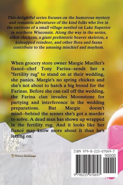 Margie Mueller thought wedding jitters were normal--until her fiancé sent her a fertility rug. She's no spring chicken, and the idea of raising a brood of Farina babies makes her panic. But before she can call the whole thing off, Tony's boisterous family descends on Moonstone with their parties, opinions, and endless interference. Then a dead man turns up--wrapped in that same fertility rug. Suddenly, Margie's wedding isn't just in danger of collapsing under family chaos--it's at the center of a murder mystery. And Tony may know more than he's admitting. Funny, quirky, and laced with small-town mischief, A Moonstone Wedding is a romantic novella with a deadly twist.