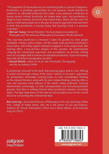Is prostitution immoral? In this book, Rob Lovering argues that it is not. Offering a careful and thorough critique of the many-twenty, to be exact-arguments for prostitution's immorality, Lovering leaves no claim unchallenged. Drawing on the relevant literature along with his own creative thinking, Lovering offers a clear and reasoned moral defense of the world's oldest profession. Lovering demonstrates convincingly, on both consequentialist and nonconsequentialist grounds, that there is nothing immoral about prostitution between consenting adults. The legal implications of this view are also brought to bear on the current discourse surrounding this controversial topic.