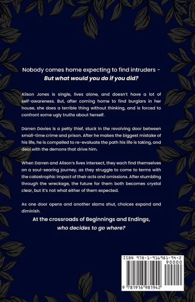 Nobody comes home expecting to find intruders - But what would you do if you did? Alison Jones is single, lives alone, and doesn't have a lot of self-awareness. But, after coming home to find burglars in her house, she reacts without thinking, and is forced to confront some very ugly truths about herself. Darren Davies is a petty thief, stuck in the revolving door between small-time crime and prison. After he makes the biggest mistake of his life, he is forced to re-evaluate the path his life is taking, and deal with the demons that drive him. When Darren and Alison's lives intersect, they each find themselves on a soul-searing journey, as they struggle to come to terms with the catastrophic impact of their acts and omissions. After stumbling through the wreckage, the future for them both becomes crystal clear, but it's not what either of them expected. As one door opens and another slams shut, choices expand and diminish. ¿¿At the crossroads of Beginning and Ending, who decides to go where?
