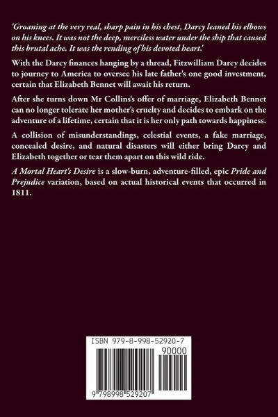 'Groaning at the very real, sharp pain in his chest, Darcy leaned his elbows on his knees. It was not the deep, merciless water under the ship that caused this brutal ache. It was the rending of his devoted heart.' With the Darcy finances hanging by a thread, Fitzwilliam Darcy decides to journey to America to oversee his late father's one good investment, certain that Elizabeth Bennet will await his return. After she turns down Mr Collins's offer of marriage, Elizabeth Bennet can no longer tolerate her mother's cruelty and decides to embark on the adventure of a lifetime, certain that it is her only path towards happiness. 'Either we both succeed, or we fail together.' A collision of misunderstandings, celestial events, a fake marriage, concealed desire, and natural disasters will either bring Darcy and Elizabeth together or tear them apart on this wild ride. A Mortal Heart's Desire is a slow-burn, adventure-filled, epic Pride and Prejudice variation, based on actual historical events that occurred in 1811.