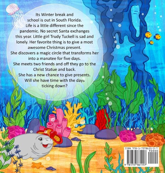 It a Christmas fictional tale of a little girl that wants to give a most awesome Christmas present. But no secret Santa exchanges are allowed at school, so she is sad. She bikes to her fishing pier in South Florida where she sees a magical circle in the water. She falls through it and becomes a manatee. She makes a manatee and shark friend. She joins them on their daily southerly swim to the statue and back. She begins to come up with ideas to give her new friends a most awesome Christmas present but there are only a few days left until Christmas. Meanwhile she keeps telling them the story of who the statue is they keep swimming around. More manatees want to know who he is. Time is ticking. Will she get to give the most awesome Christmas present?