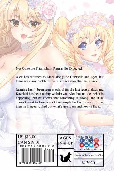 Not Quite the Triumphant Return He Expected. Alex has returned to Mars alongside Gabrielle and Nyx, but there are many problems he must face now that he is back. Jasmine hasn't been seen at school for the last several days and Kazekiri has been acting withdrawn. Alex has no idea what is happening, but he knows that something is wrong, and if he doesn't want to lose two of the people he has grown to love, then he'll need to find out what's going on and how to fix it.