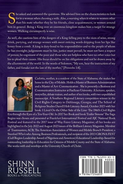 S he asked and answered the questions. She advised him on the characteristics to look for in a woman when choosing a wife. Also, a warning when it relates to women other than his mate whether they be his friends, close acquaintances, or women around him in general. Being a King over an enormous kingdom makes him a target for strange women. Walking circumspectly is wise. As well, she cautions him of the dangers of a King falling prey to the vices of wine, strong drink, partying, and strange women with sweet enticing words dripping from her lips like honey from a comb. A king is duty-bond to his responsibilities and to the people of whom he has oversight; judgements must be fair, justice must prevail; he must not have a respect of person; be cognizant of the poor and those who are helpless who have no other voice but his to plead their causes. His focus should be on his obligations and not be drawn away by the allurements of the world. In the words of Solomon, "My son, hear the instruction of my father, and forsake not the law of thy mother," [Proverbs 1:8].