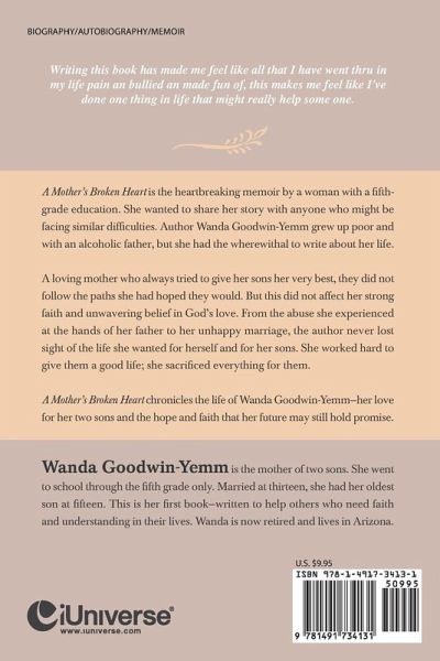 A Mother's Broken Heart is the heartbreaking memoir by a woman with a fifth-grade education. She wanted to share her story with anyone who might be facing similar difficulties. Author Wanda Goodwin-Yemm grew up poor and with an alcoholic father, but she had the wherewithal to write about her life. A loving mother who always tried to give her sons her very best, they did not follow the paths she had hoped they would. But this did not affect her strong faith and unwavering belief in God's love. From the abuse she experienced at the hands of her father to her unhappy marriage, the author never lost sight of the life she wanted for herself and for her sons. She worked hard to give them a good life; she sacrificed everything for them. A Mother's Broken Heart chronicles the life of Wanda Goodwin-Yemm-her love for her two sons and the hope and faith that her future may still hold promise.